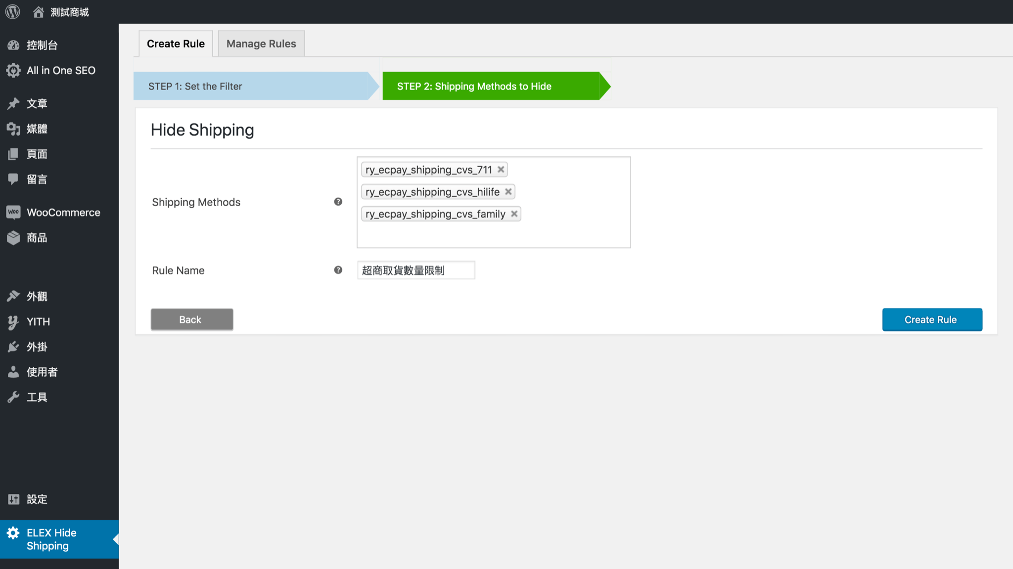 第二步隱藏運送方式,我們設定的規則就是超過 5 公斤不能超商取貨,因此在這裡我們將所有超商取貨的運送方式都加入。規則名稱僅供識別,隨意自訂就可以了,留空系統則會自動產生。